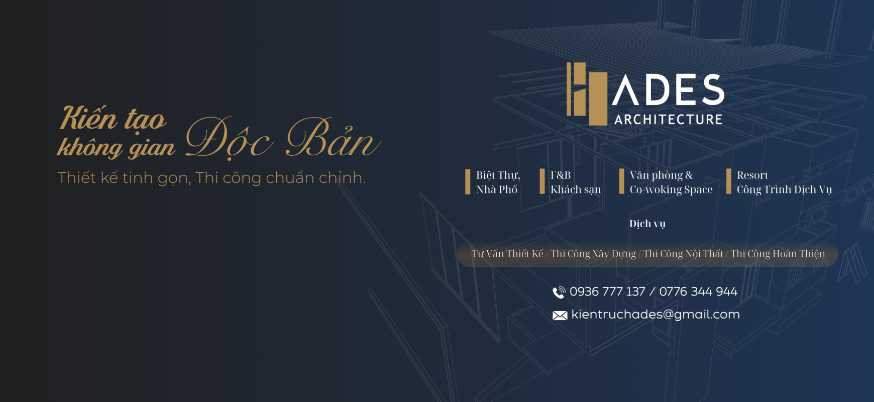 HADES quy tụ những con người nhiệt huyết, sở hữu nền tảng kiến thức và kinh nghiệm đa dạng trong lĩnh vực thiết kế - xây dựng - nội thất, cùng theo đuổi khát vọng tạo nên những công trình có chiều sâu và bản sắc. Chúng tôi tin rằng môi trường sống và làm việc ảnh hưởng trực tiếp đến chất lượng cuộc sống, vì thế mỗi dự án sẽ được tiếp cận như một bài toán tổng thể về công năng, thẩm mỹ và cảm xúc. HADES cung cấp giải pháp trọn gói từ ý tưởng kiến trúc đến thi công hoàn thiện, với từng công trình được triển khai riêng biệt theo phong cách sống và tiêu chuẩn cá nhân của từng gia chủ. Thông qua quy trình chuẩn mực, đội ngũ chuyên môn dày dạn kinh nghiệm và hệ thống kiểm soát chất lượng nghiêm ngặt, HADES mang đến trải nghiệm dịch vụ nơi tiện nghi, sang trọng và chiều sâu kiến trúc hòa quyện một cách trọn vẹn.